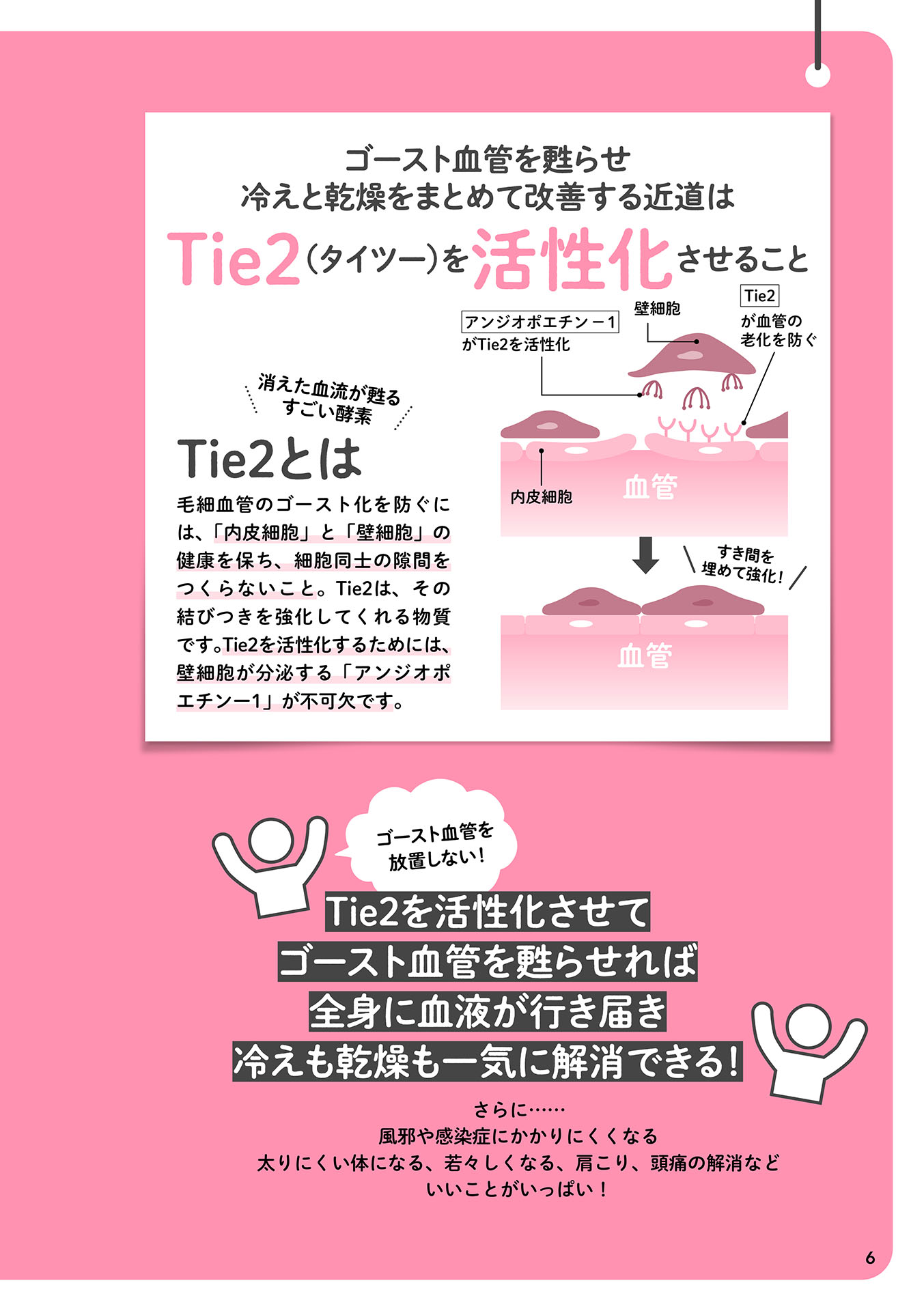 この『Tie2』を日常の中で活性化することで、自然と冷えも乾燥も無縁の体になっていきます。